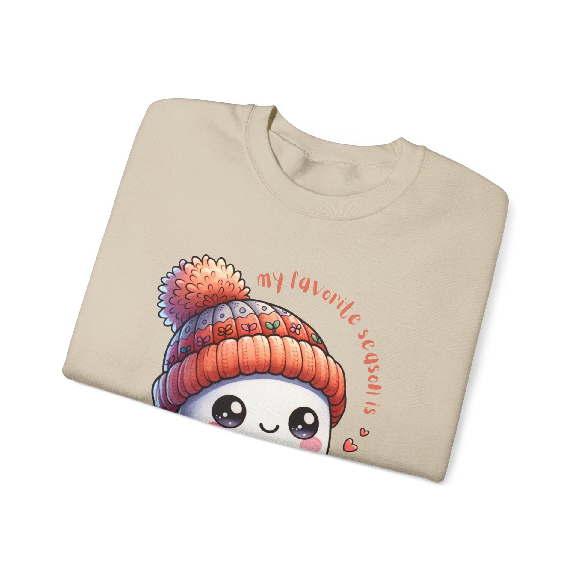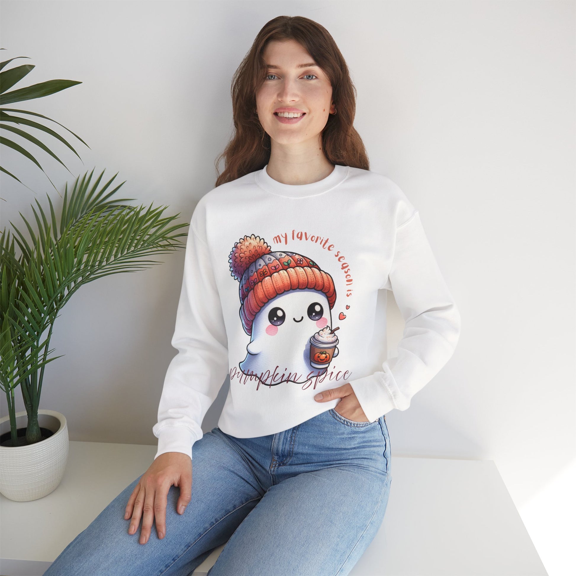 Celebrate your love for fall, coffee, and all things pumpkin spice with this adorable autumn sweatshirt! Featuring a cute little ghost in a stocking cap holding a cup of coffee and surrounded by pumpkins, this cozy pullover is the perfect mix of spooky and sweet. The playful phrase βMy Favorite Season Is Pumpkin Spiceβ makes it your go-to top for coffee runs, pumpkin patch visits, or curling up with your favorite latte.