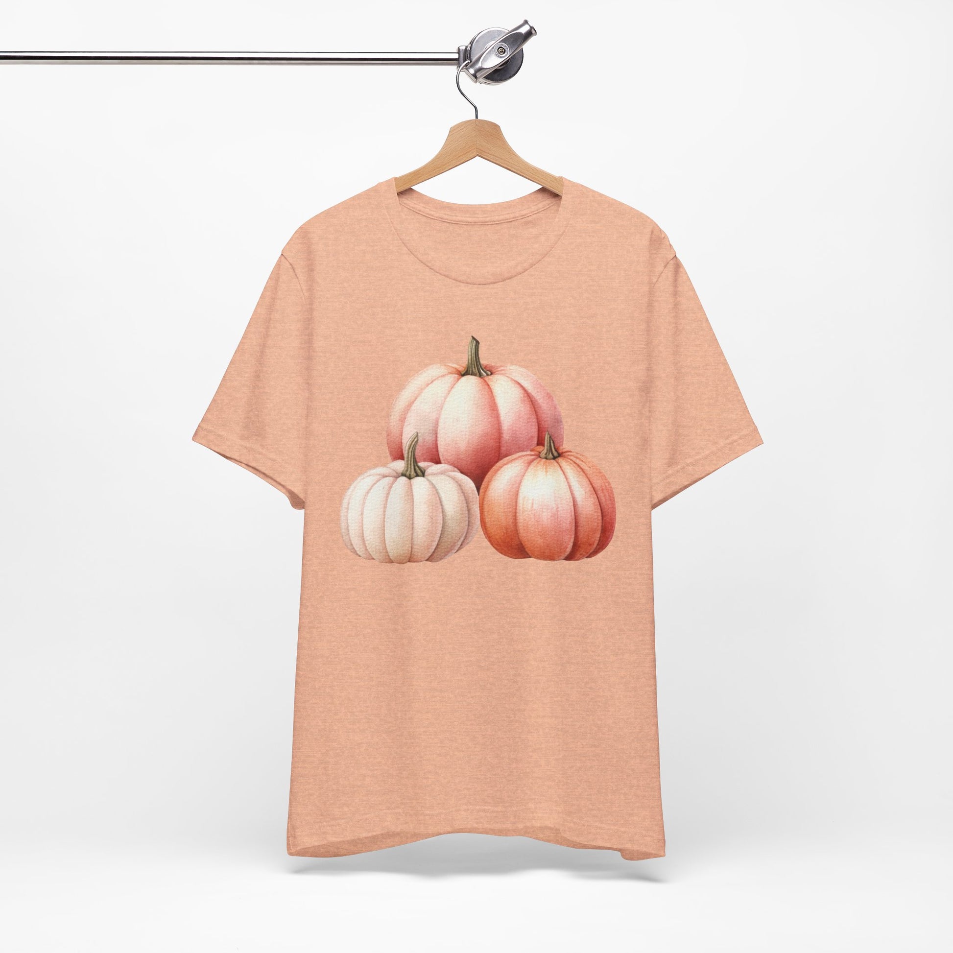The lightweight fabric makes it ideal for layering, enhancing your wardrobe for any season. The breathable material keeps you cool, making it suitable for both casual outings and semi-formal events. With its charming design featuring soft, pastel pumpkins, this tee adds a touch of autumn warmth to your ensemble, making it great for fall festivals, Halloween celebrations, or cozy family gatherings. It’s an excellent choice for fashion-forward individuals seeking to express their seasonal spirit. Celebrate the vibes of fall while staying comfortable and chic!