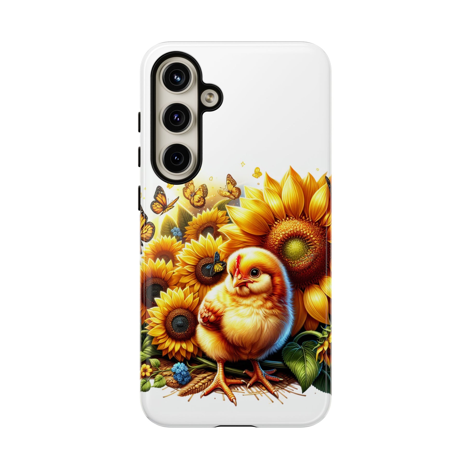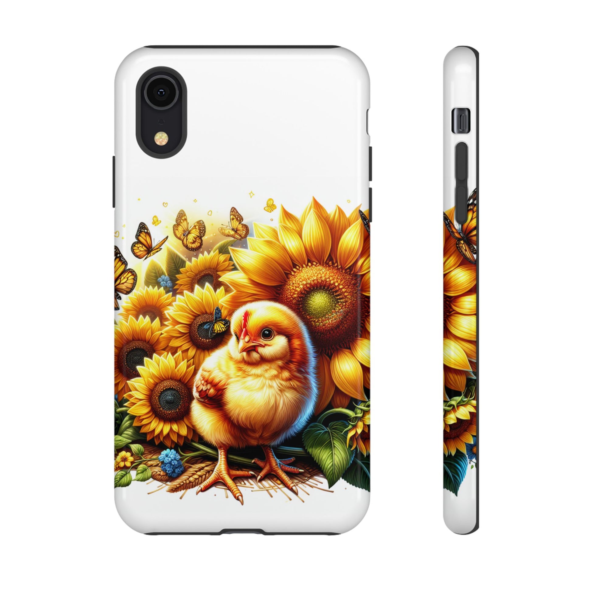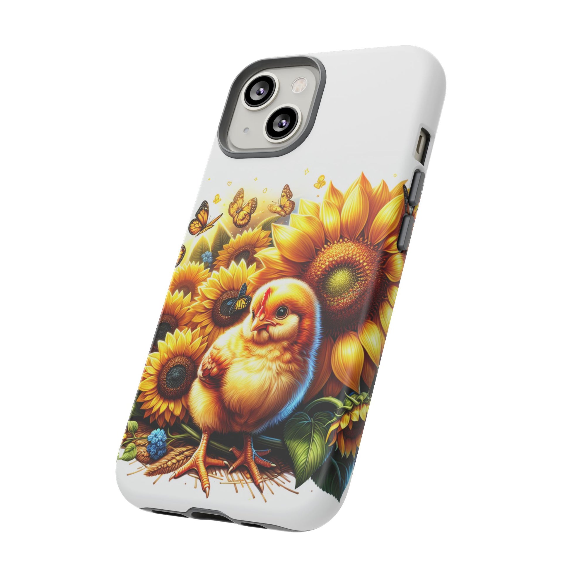 - **Adorable Design**: Featuring a cute, hand-drawn chicken surrounded by vibrant sunflowers and fluttering butterflies, this phone case is sure to bring a smile to your face every time you use your phone.