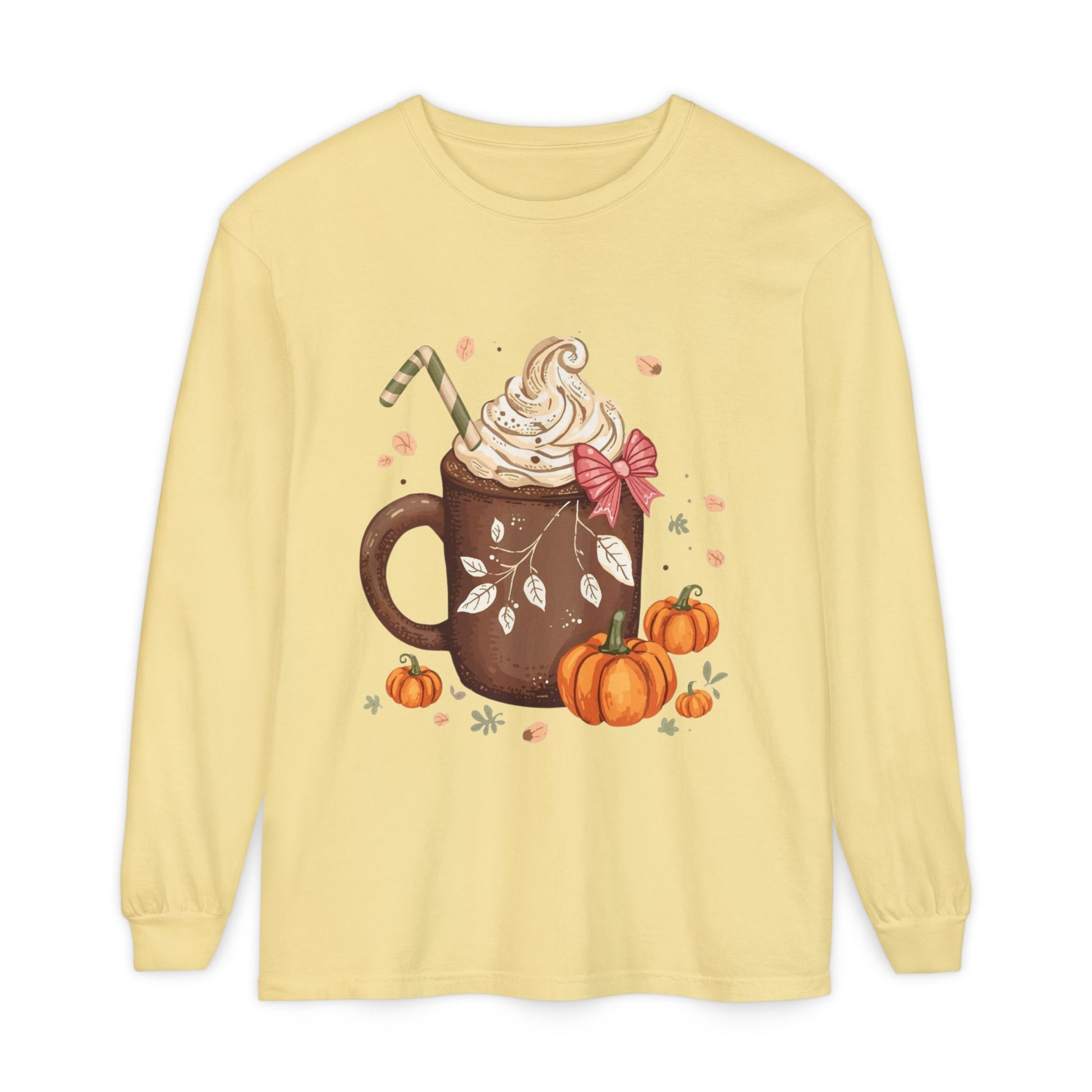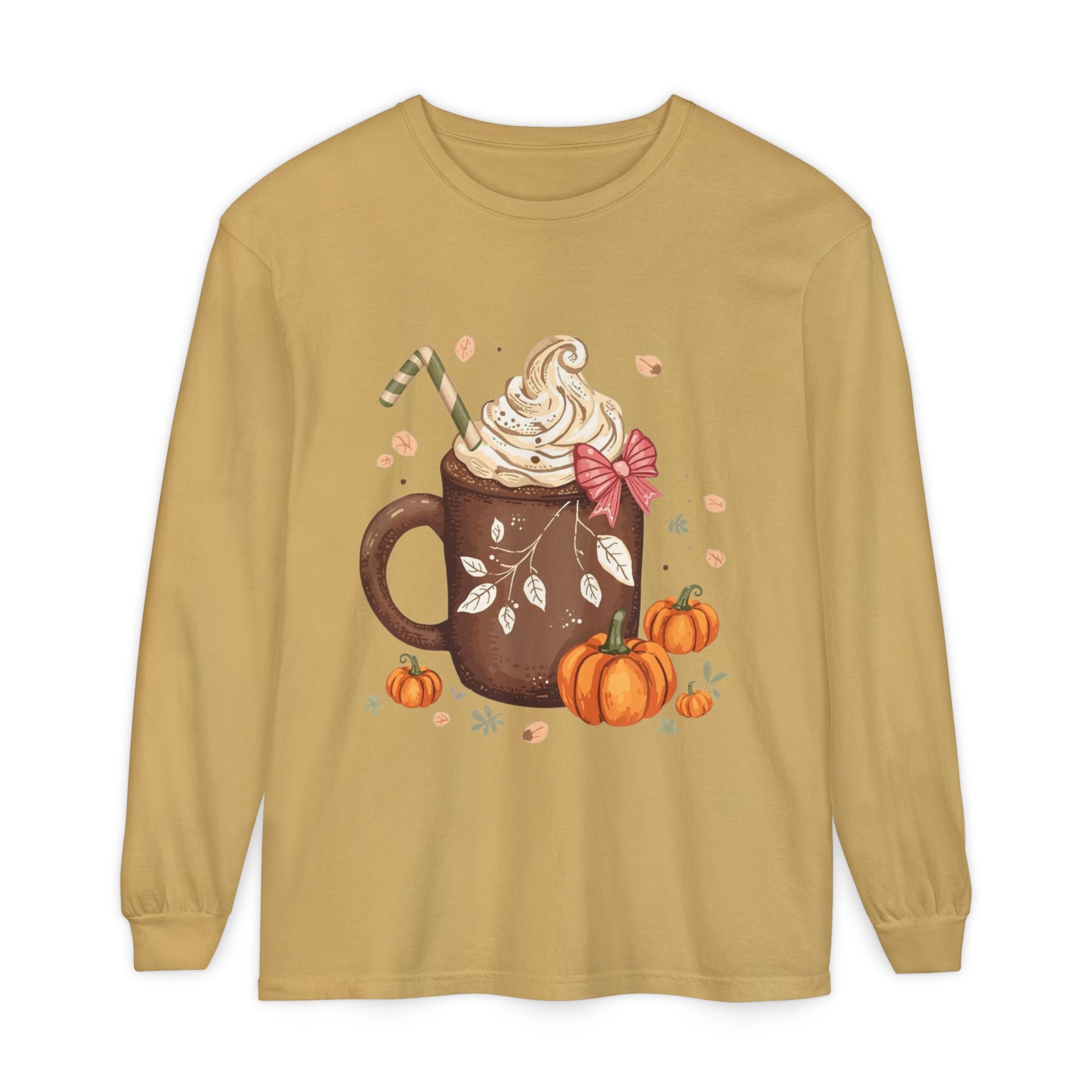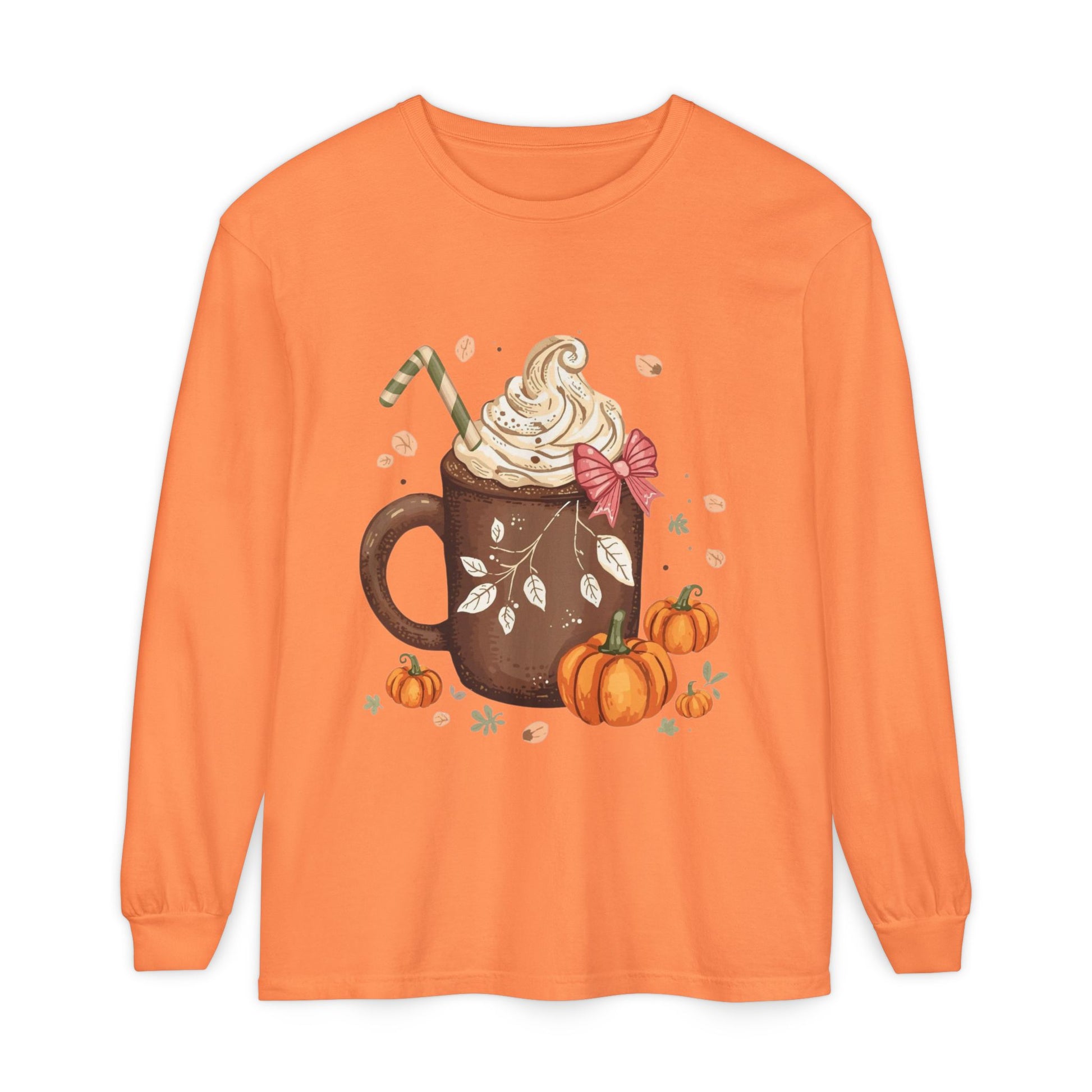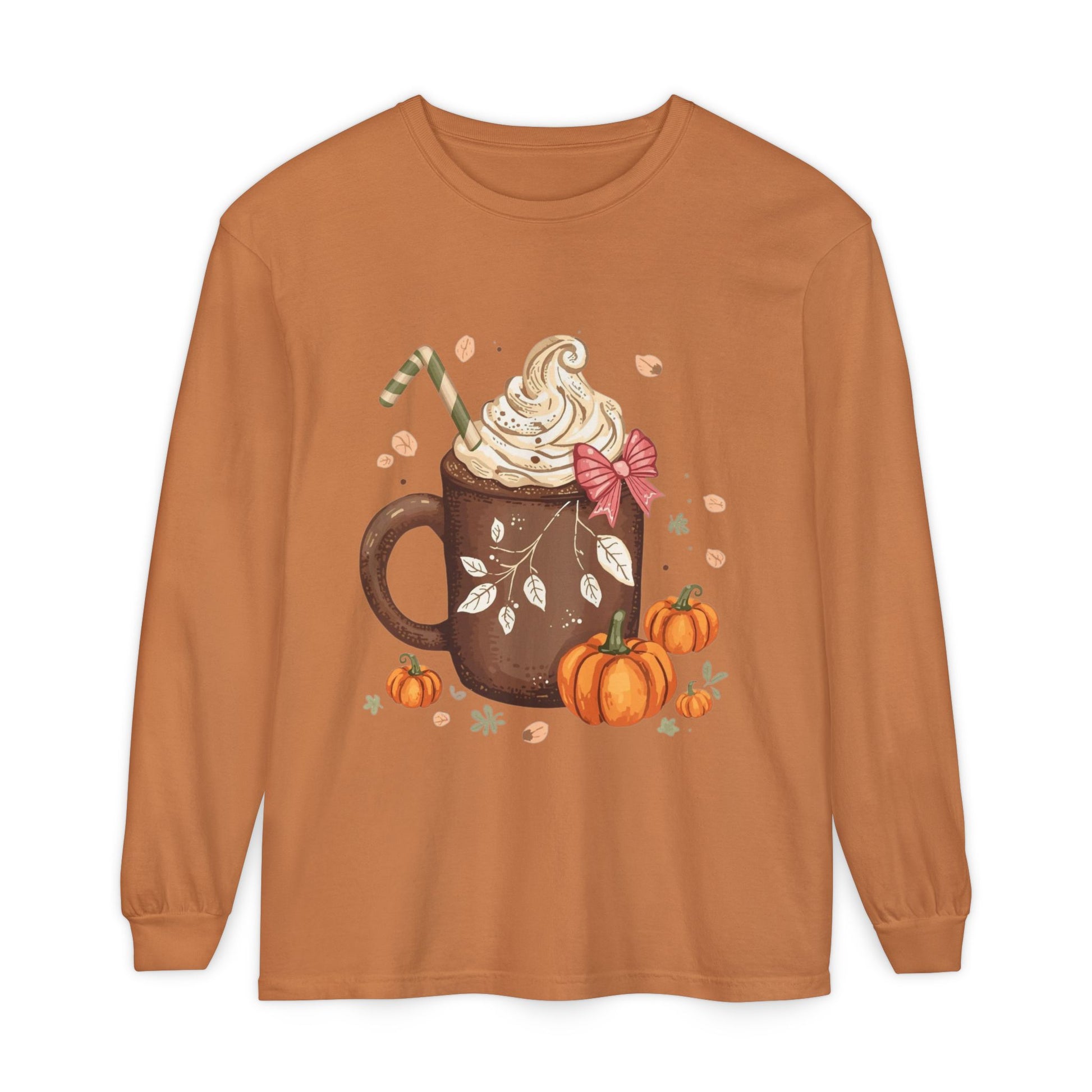 Cute Fall Pumpkin Spice Long Sleeve T-Shirt, Pumpkin Coffee Tee, Autumn Fashion, Cozy Gift for her, Thanksgiving Shirt