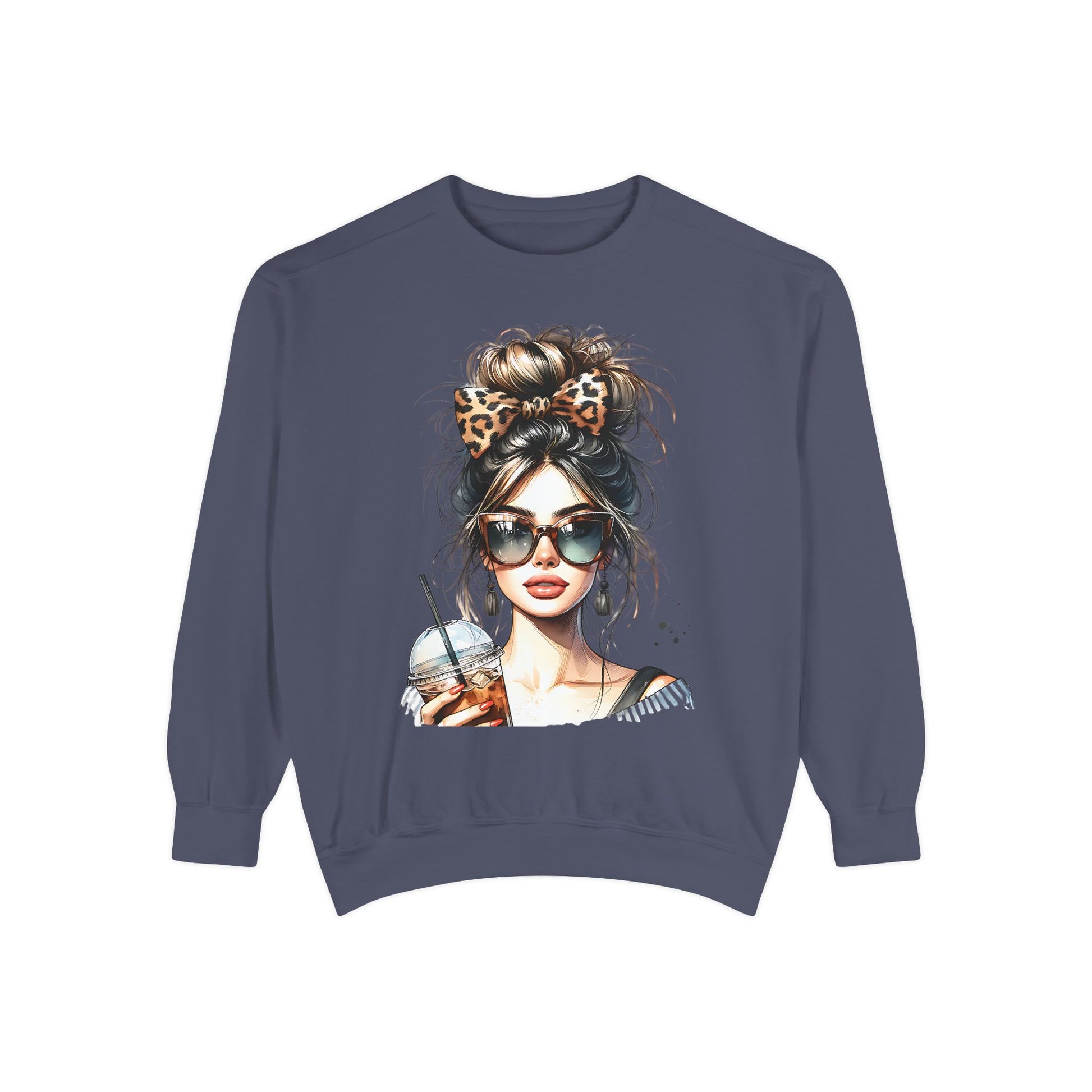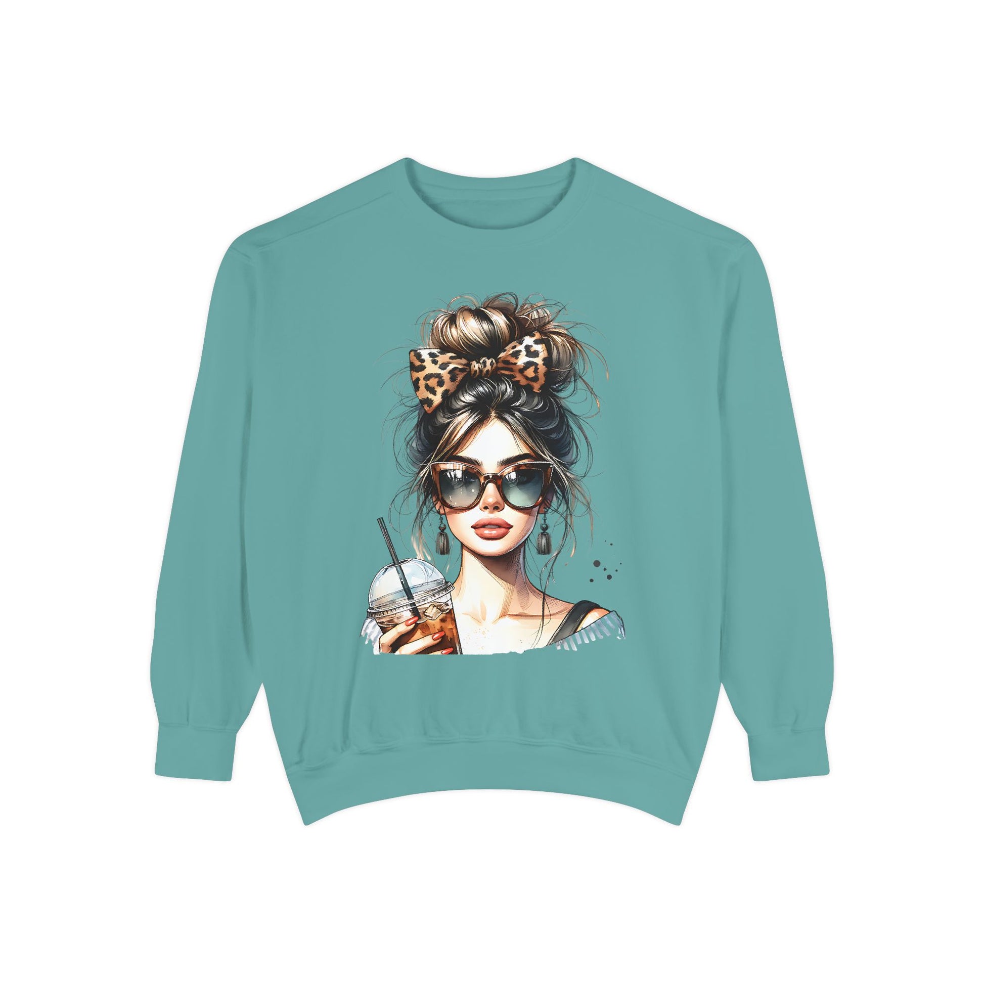 Bring your coffee-loving sass to life with our Trendy Girl Iced Coffee Sweatshirt! This stylish graphic shirt features a chic girl with her hair in a messy bun, accented with a leopard print bow, rocking sunglasses, and holding an iced coffee — the ultimate symbol of effortless cool and confident style.