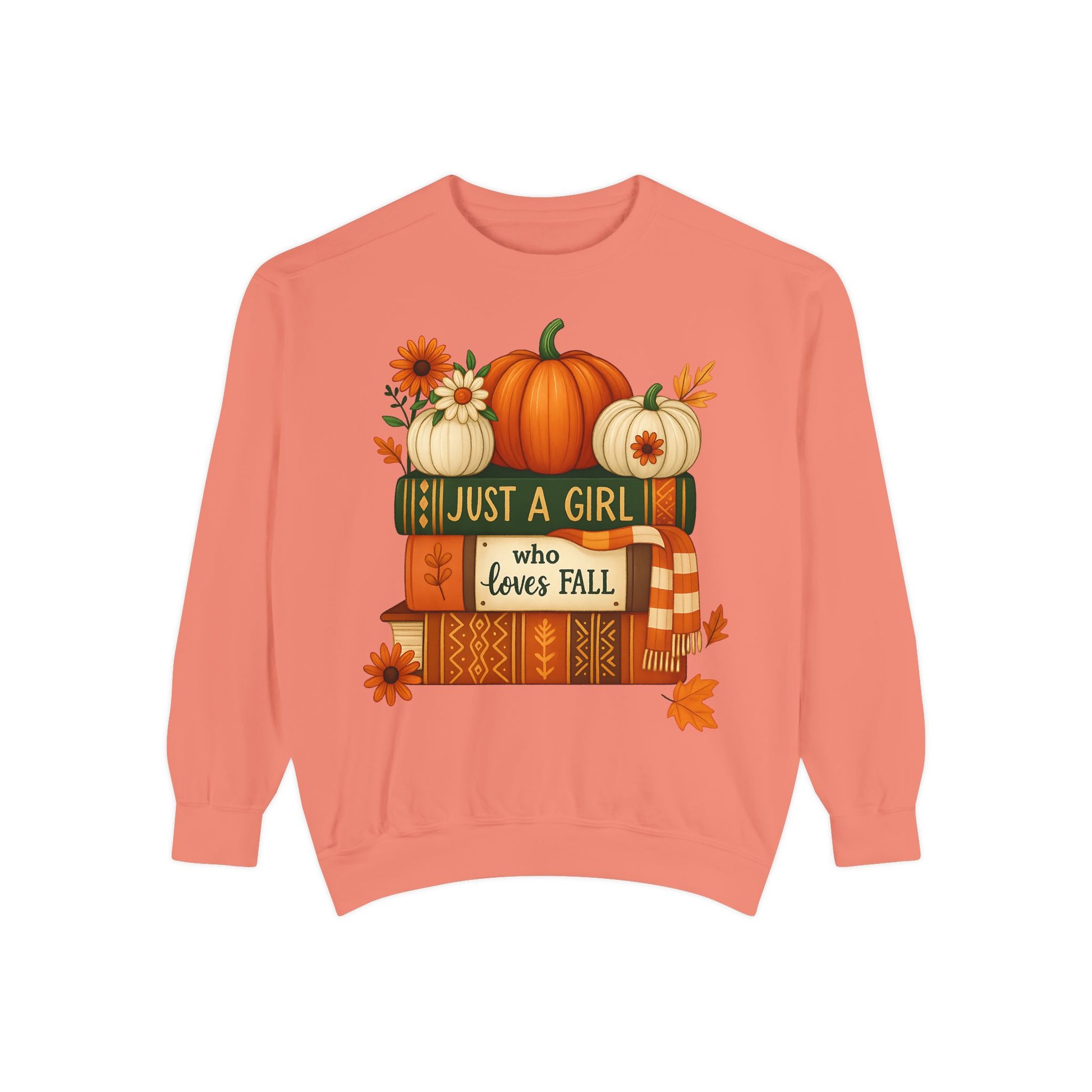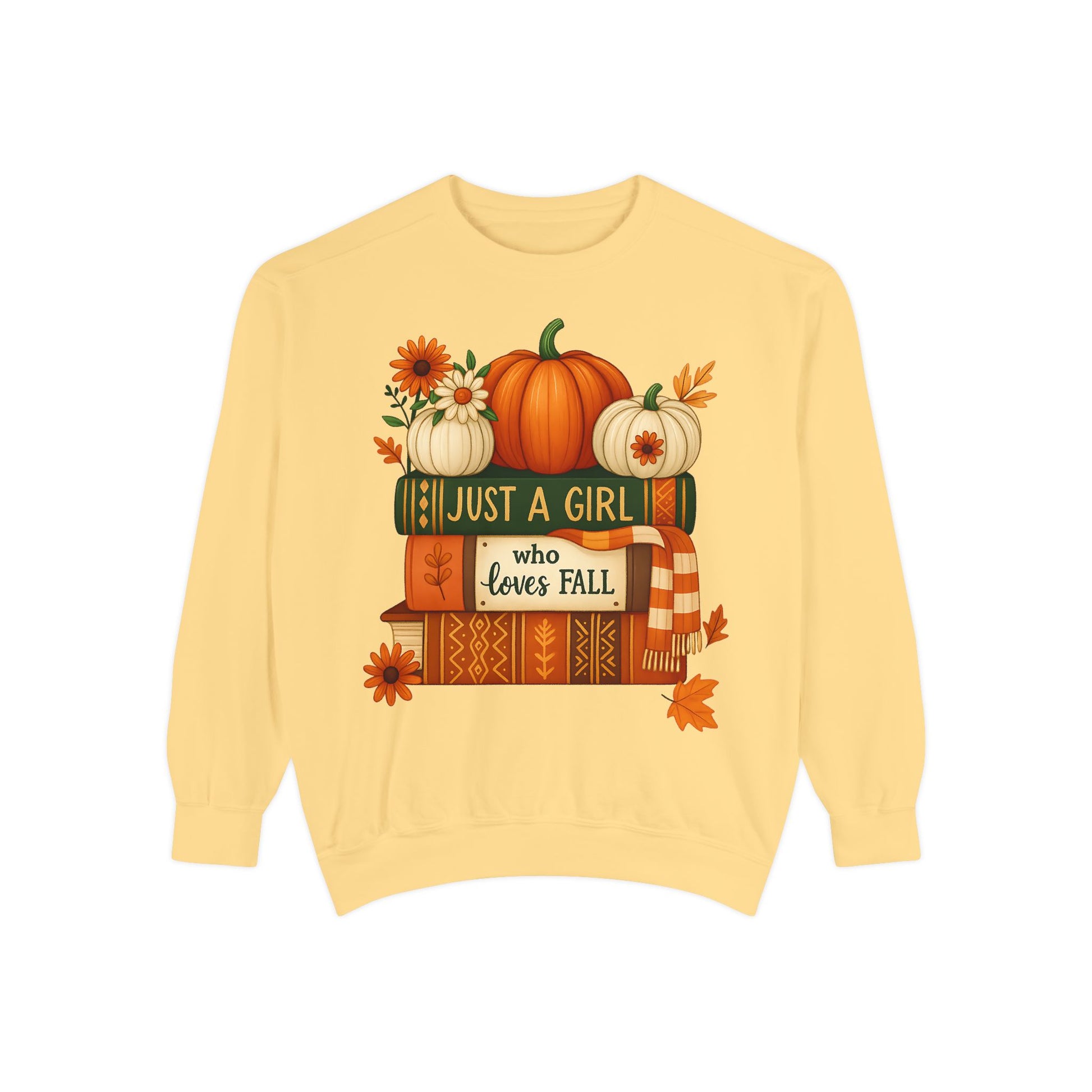 Celebrate your favorite season in comfort and style with our Just a Girl Who Loves Fall Sweatshirt. This cozy crewneck features a charming autumn scene with stacked books, pumpkins, and falling leaves, capturing everything you love about the season — warm drinks, crisp air, and cozy moments.