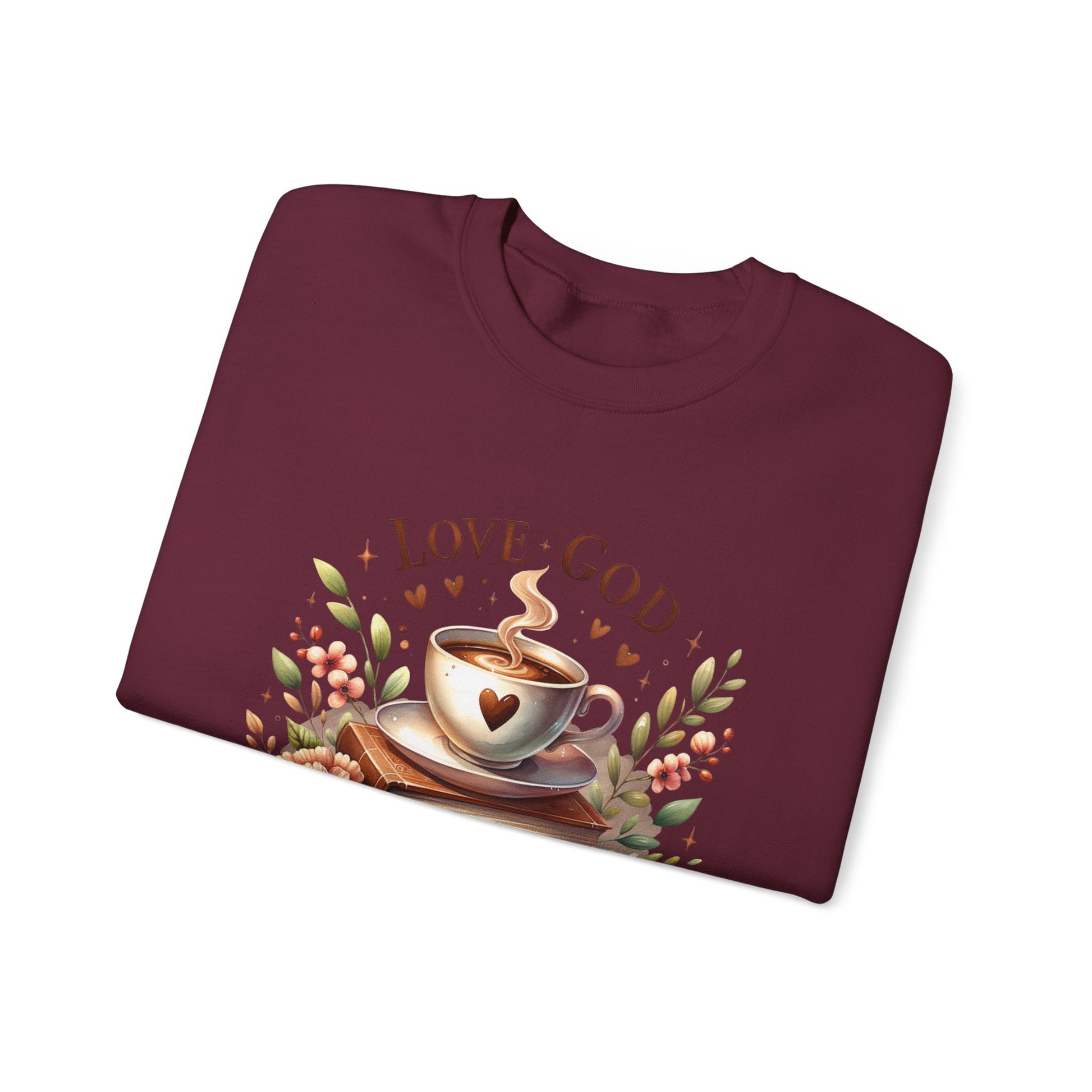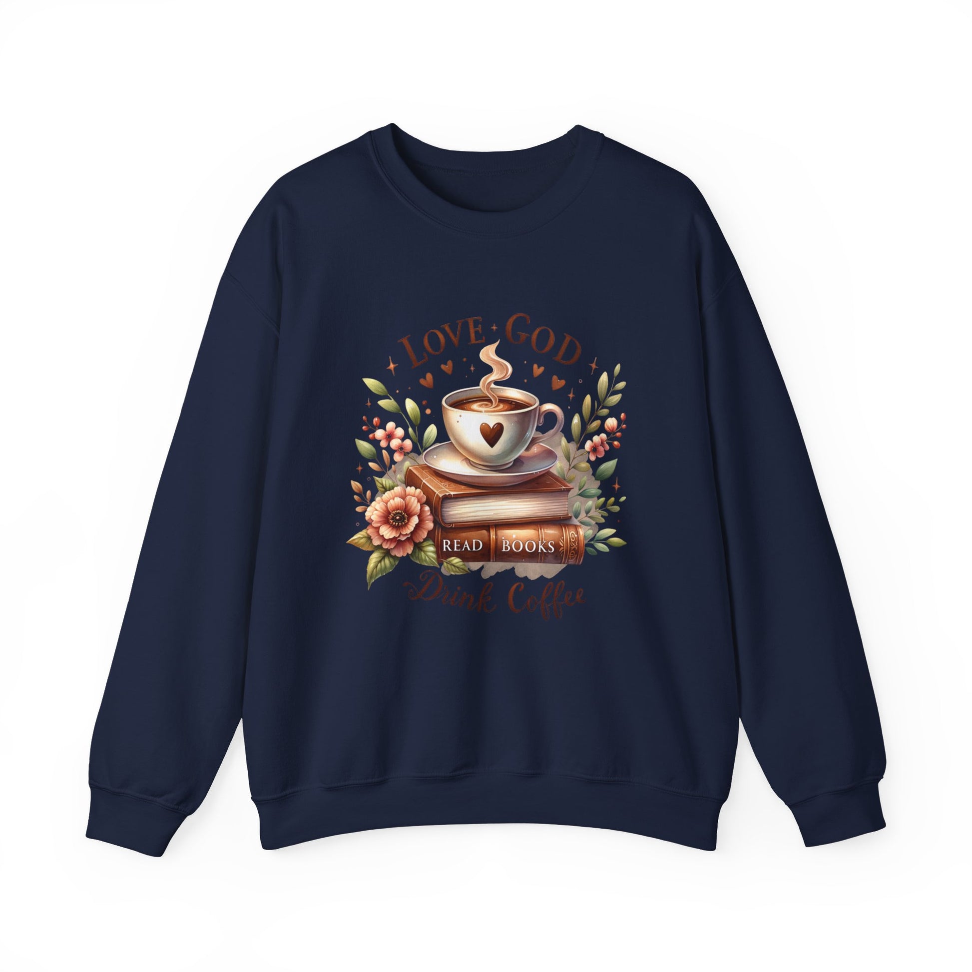 Love God, Read Books, Drink Coffee Sweatshirt, Inspirational Gift for Book Lovers, Perfect for Coffee Lovers, Fall & Winter Fashion