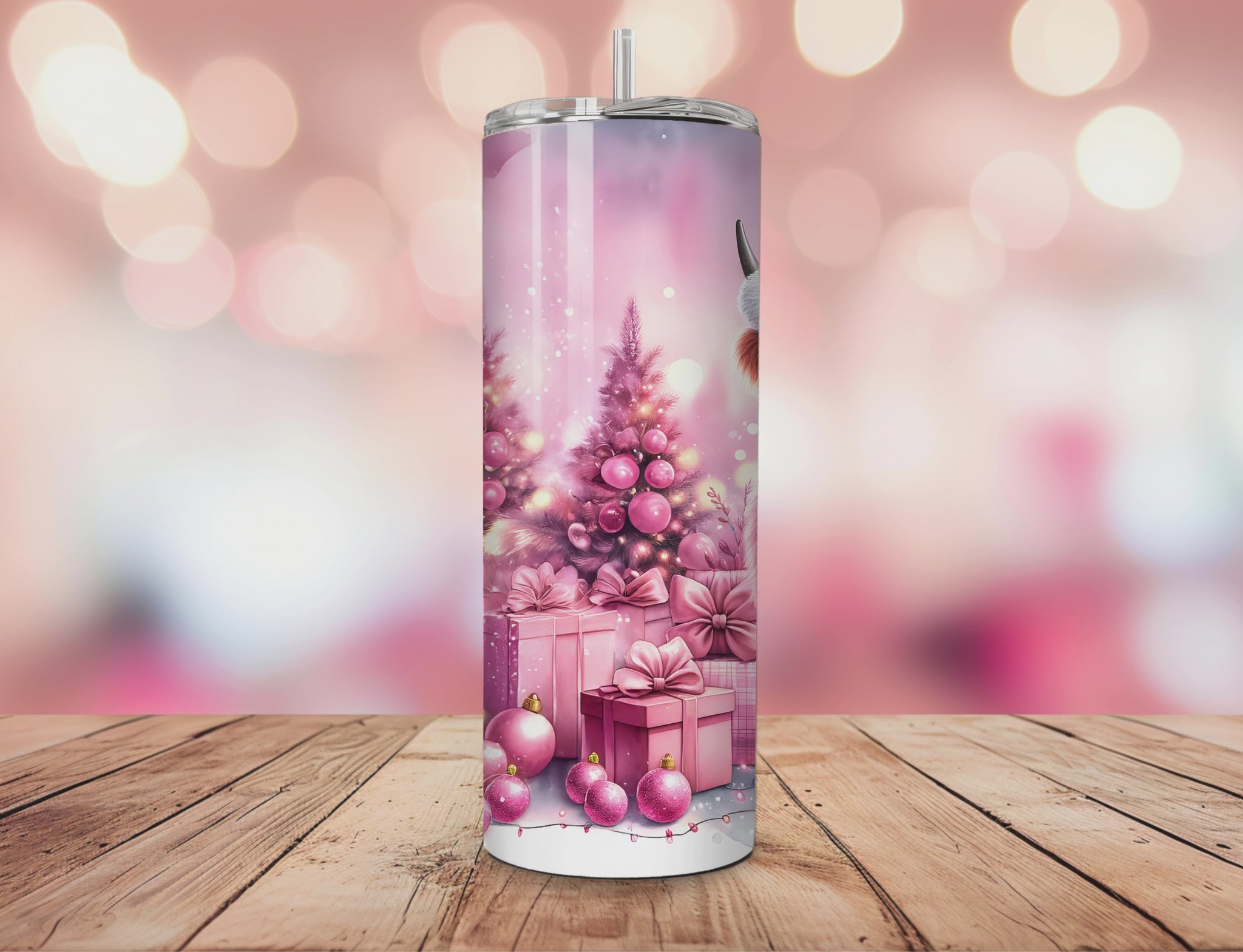 Add a touch of farmhouse fun to your holiday sips with this Winter Wonderland Pink & White Highland Cow tumbler! Showcasing a cozy Highland Cow sporting a festive cap, surrounded by charming pink presents and holiday trees, it’s the perfect way to spread cheer while keeping your drinks cozy in style.