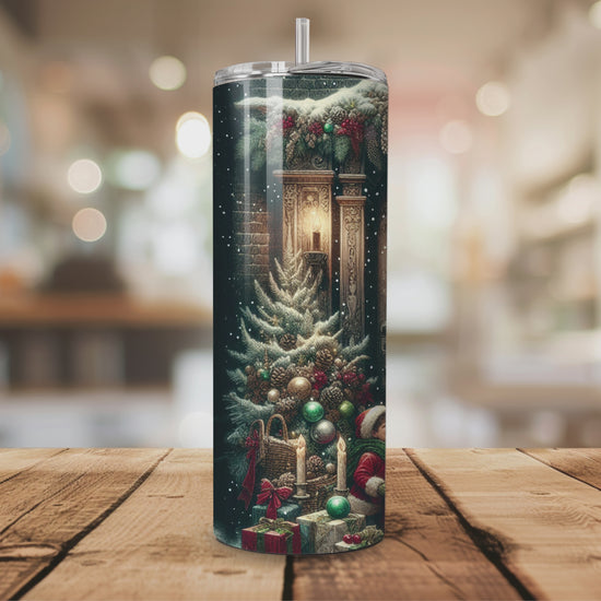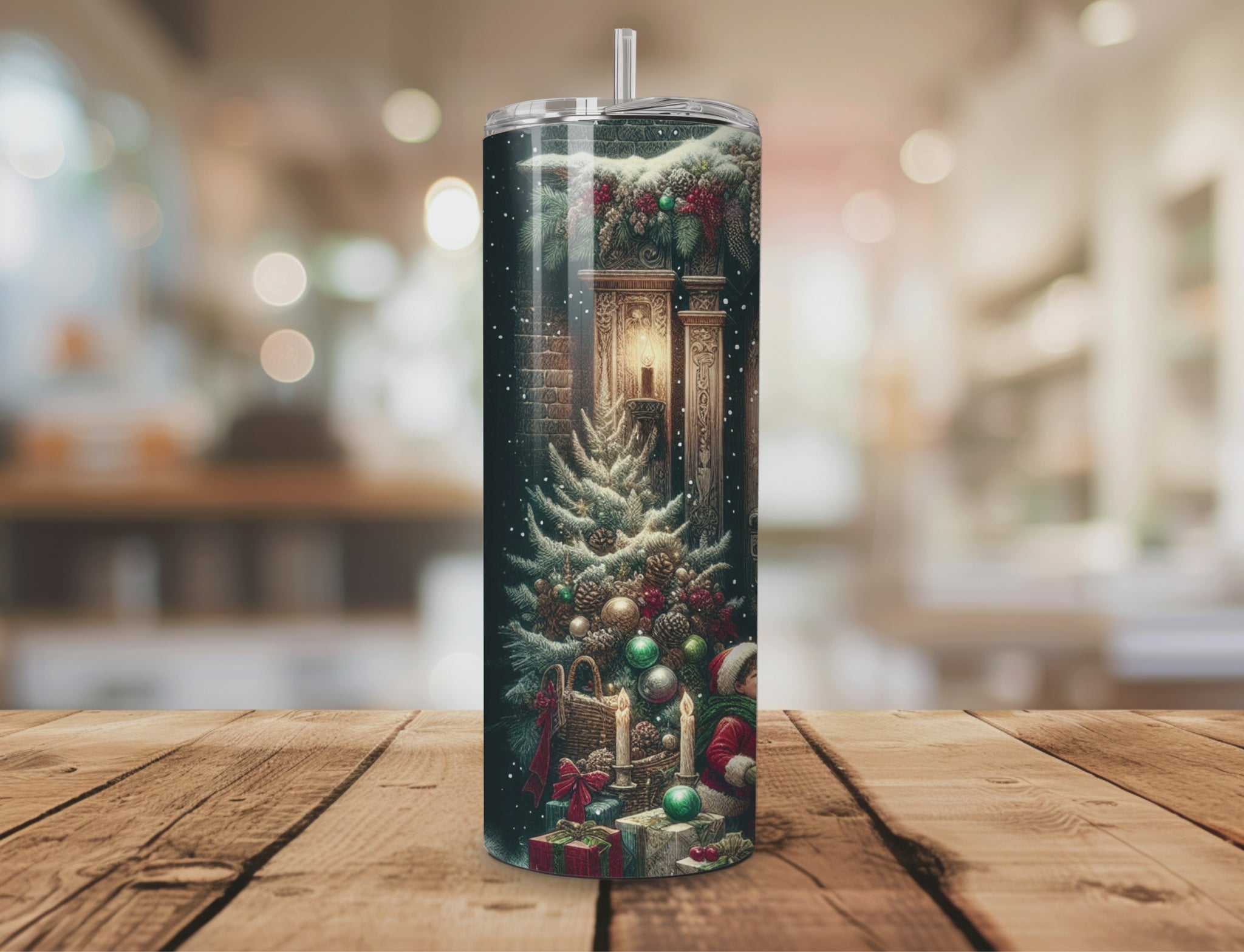 Christmas tumbler, Santa and child tumbler, snowy night tumbler, cozy Christmas drinkware, 20oz skinny tumbler, winter scene tumbler, nostalgic Christmas gift, sentimental holiday tumbler, Santa design cup, Christmas coffee tumbler, stainless steel holiday cup, hot cocoa mug, festive winter drinkware, Christmas magic tumbler, child talking to Santa mug, cozy holiday gift, Christmas gift for her, warm winter aesthetic tumbler, Santa Christmas scene cup, Christmas stocking stuffer