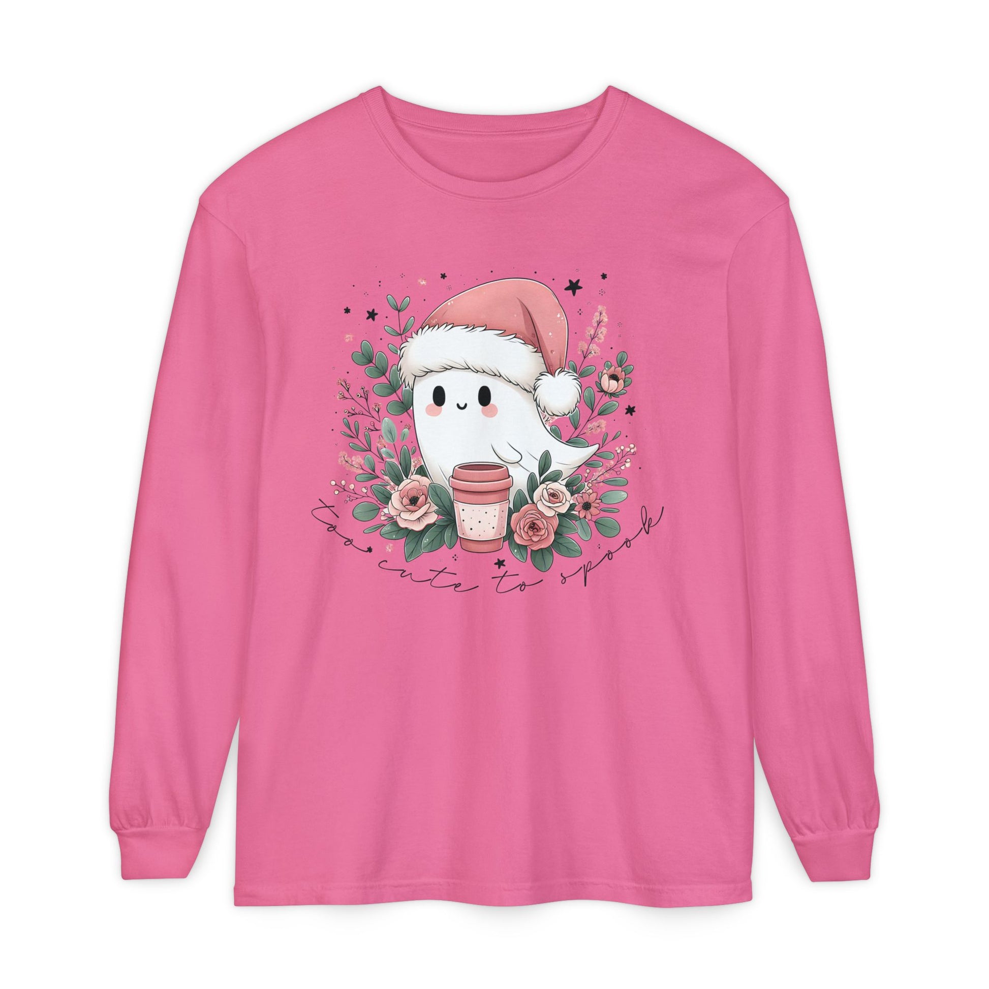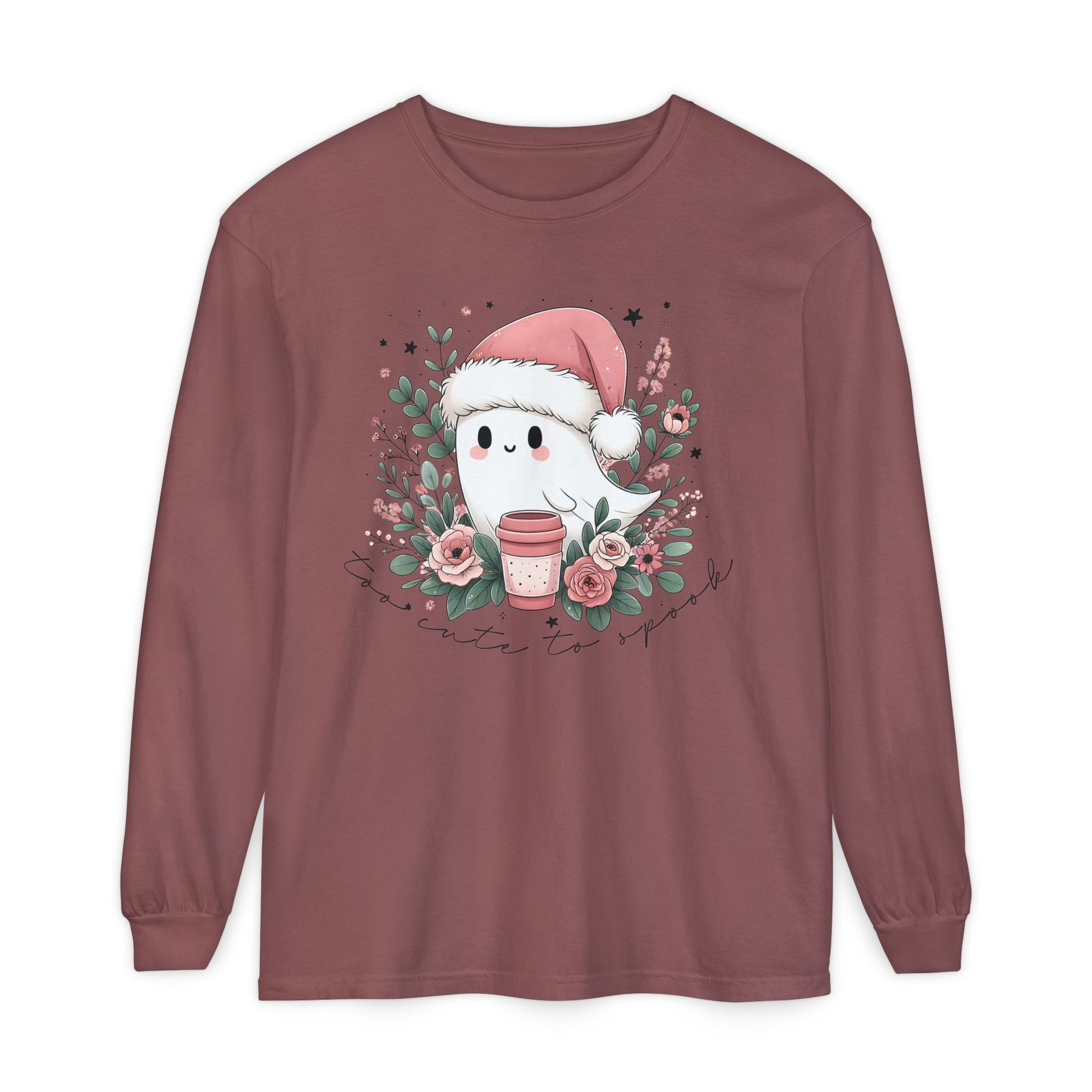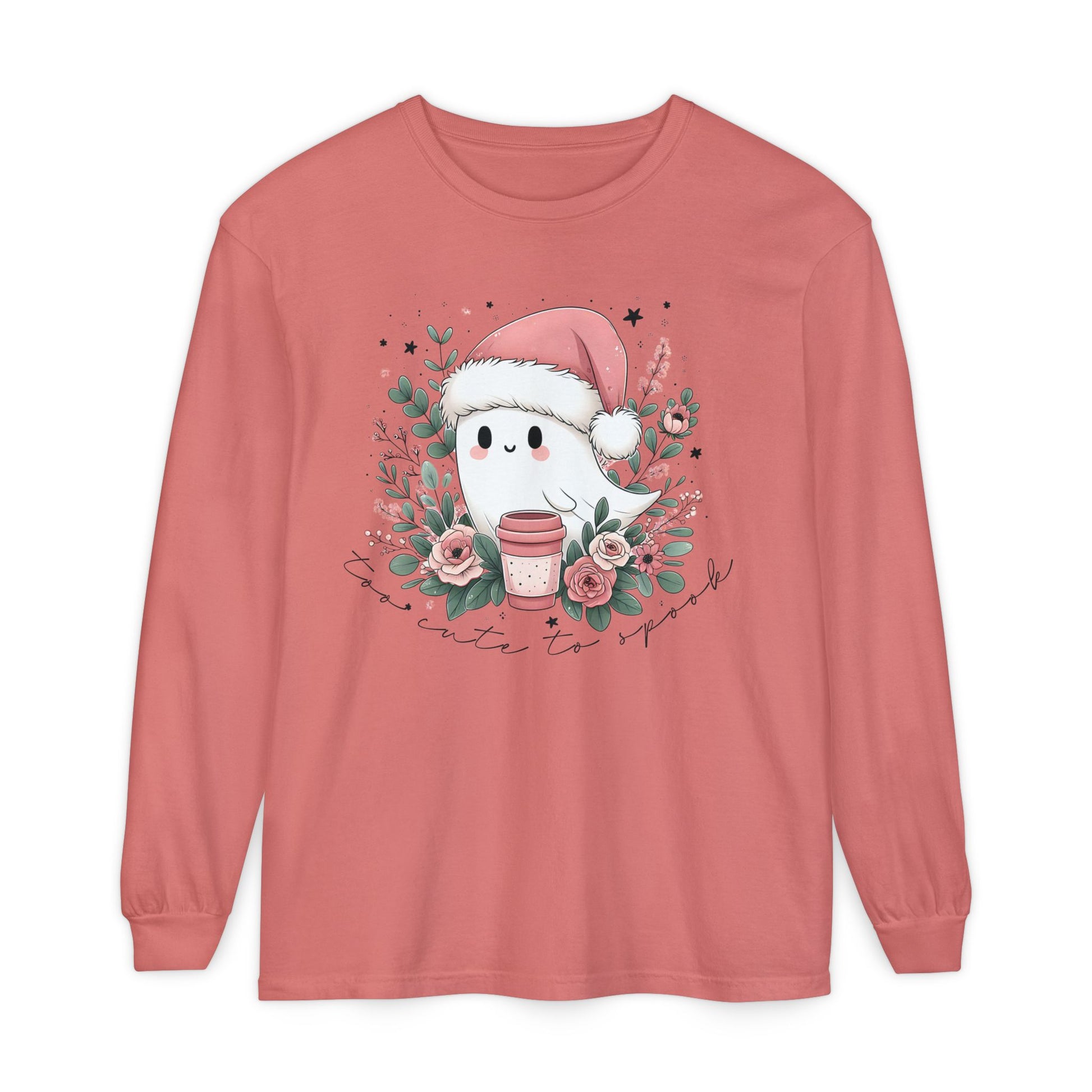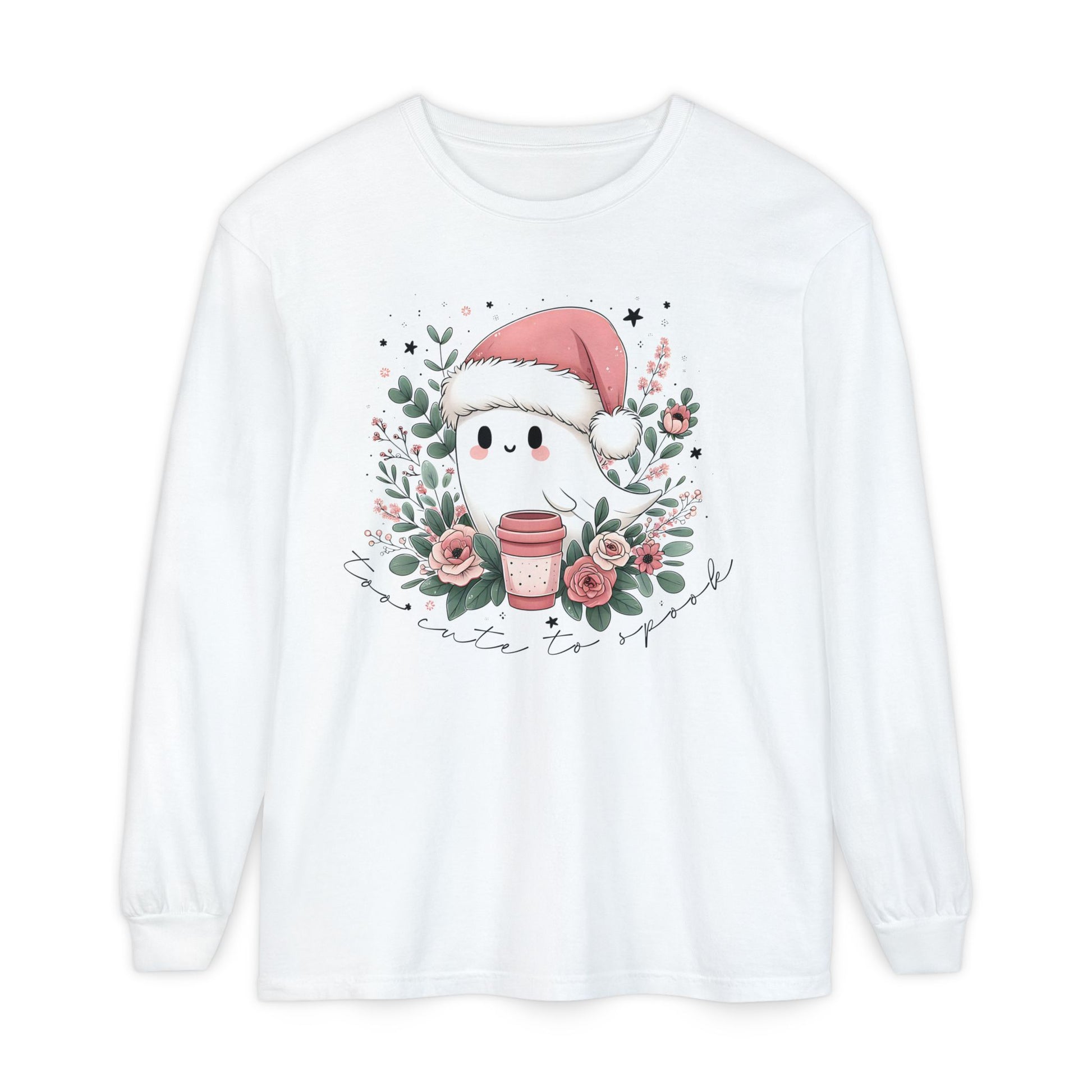 Too Cute to Spook Long Sleeve T-Shirt, Watercolor Ghost with Pink Santa Hat, Coffee & Florals, Pastel Christmas Holiday Apparel