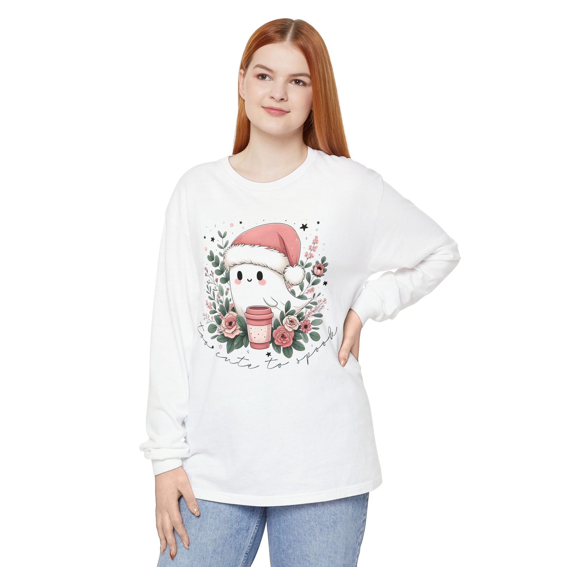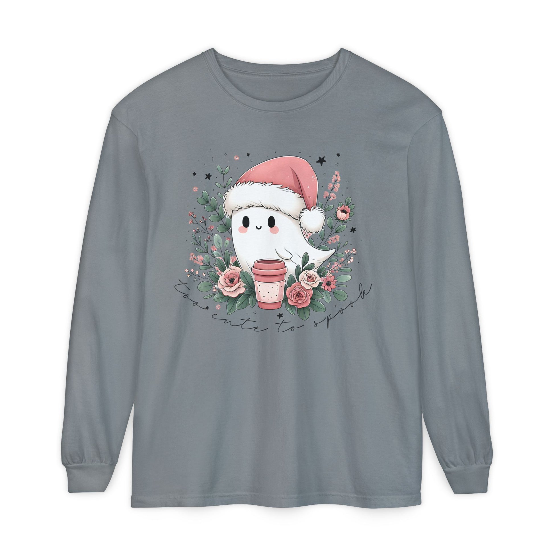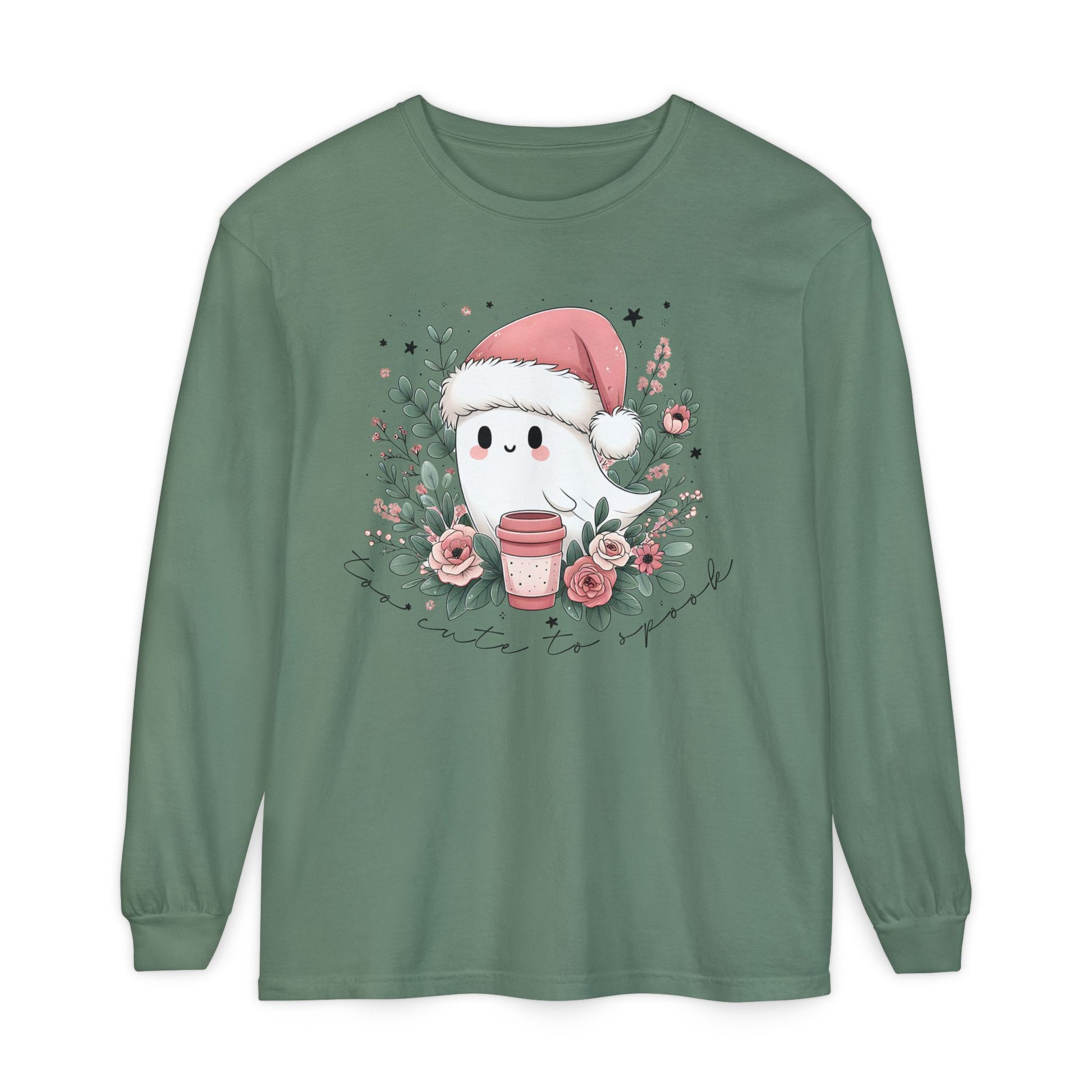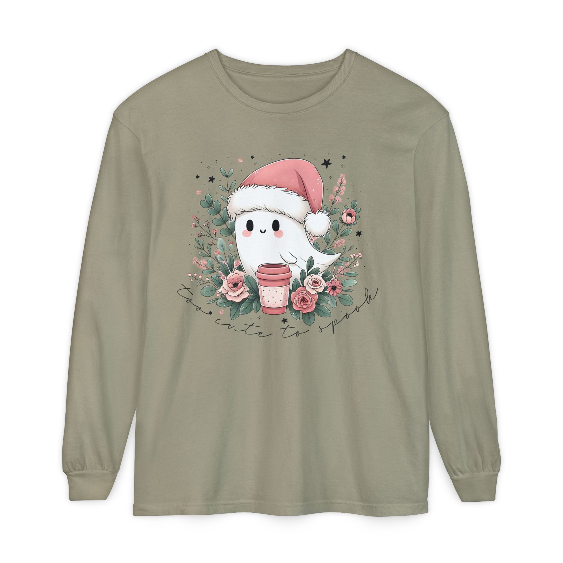 Too Cute to Spook Long Sleeve T-Shirt, Watercolor Ghost with Pink Santa Hat, Coffee & Florals, Pastel Christmas Holiday Apparel