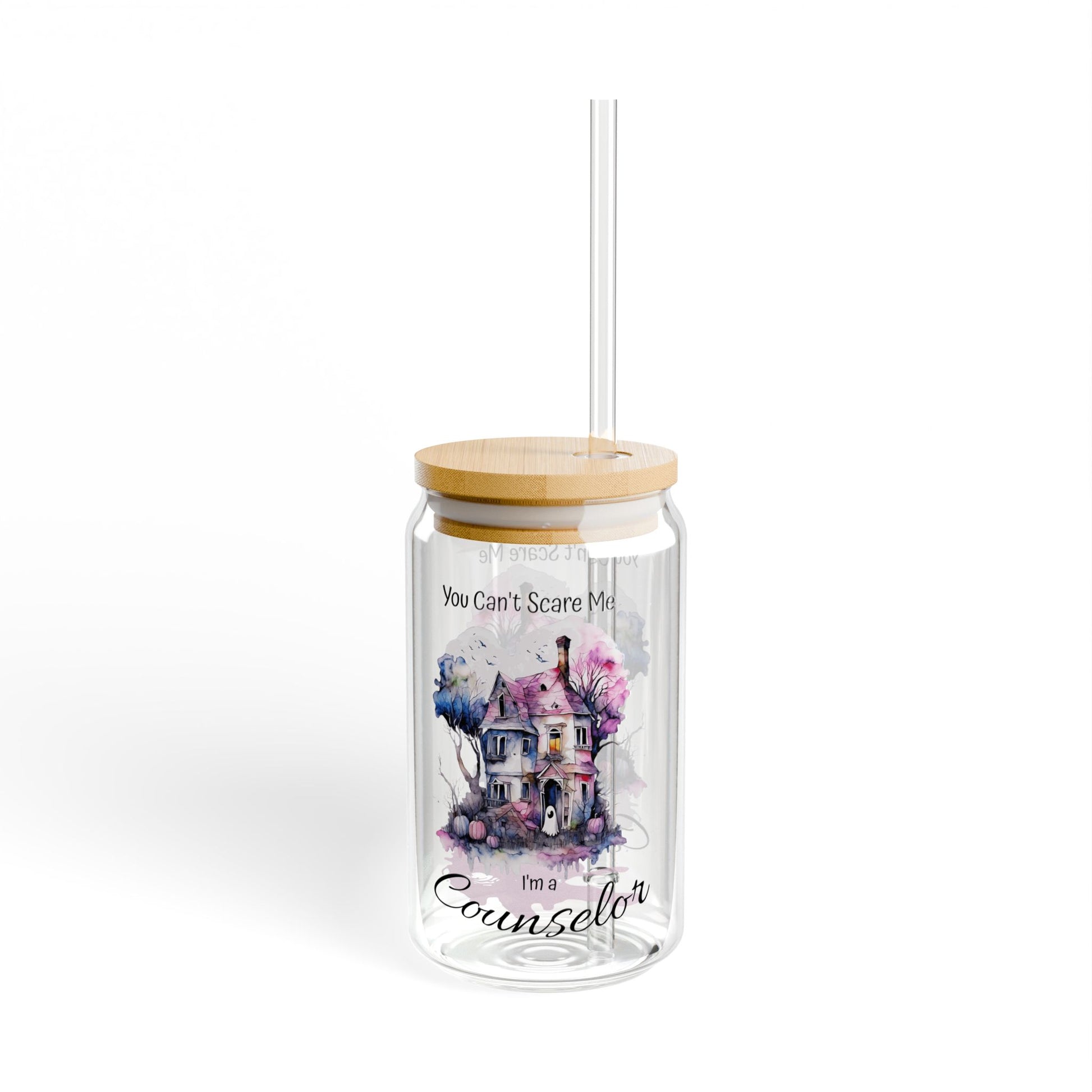 You Can't Scare Me I'm a Counselor Sipper Glass Can Featuring a Cute Watercolor Haunted House with Halloween Elements, 16oz